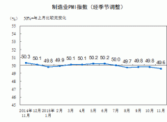 2015年11月份,中国制造业采购经理指数(PMI)为49.6%,比上月回落0.2个百分点。 分企业规模看,大型企业PMI为51.2%,比上月上升0.2个百分点,在扩张区间呈现企稳走势;中、小型企业PMI为48.3%和...